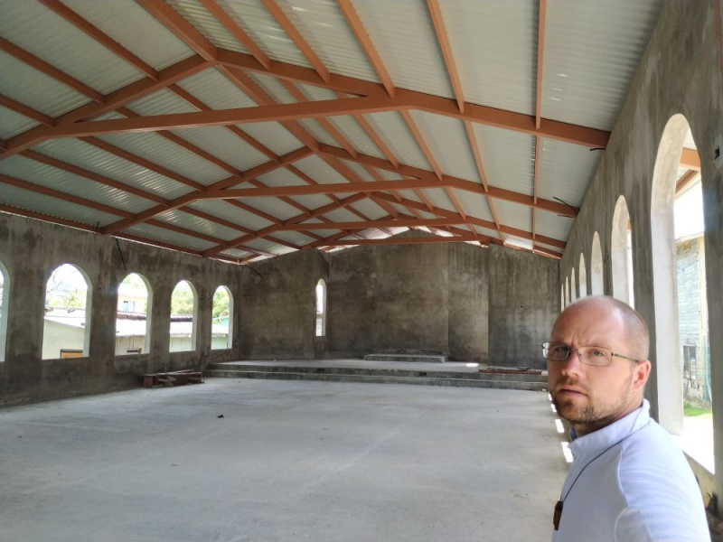 Tento čas však nedotkol nášho Misijného centra Božieho milosrdenstva, ktoré v uplynulých mesiacoch žilo čulým ruchom. Namiesto hlasov farníkov sa dvorom niesli údery kladív, pribíjania klincov, šúchanie lopát miesiacich štrk s cementom. Celú túto symfóniu neúnavne dopĺňal monotónny zvuk generátora na výrobu elektriny, prskanie zváračky a hlas brúsky, ktoré prenikavo „hrali“ svoje pasáže v celom tomto orchestri. Spomalenie pastoračného tempa sme totiž využili na konštrukčné práce, vybudovanie stĺpovej pasáže a prekrytie viacerých častí centra novými strešnými krytinami. Cieľom bolo nielen chrániť dvere, či fasády budov pred zubom času a počasia, ktoré nemilosrdne nahlodávajú už takmer celý dvor, no najmä vytvoriť prekryté priestory a tieň, pre prácu a stretania pastoračných skupiniek v budúcnosti.